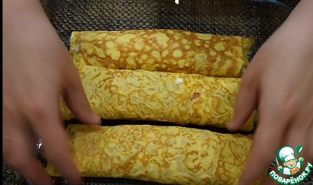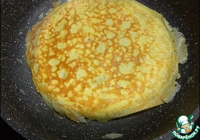 Приготовим блины, для этого необходимо взбить венчиком яйца с молоком и солью. Разогреть сковороду, добавить растительное масло. Распределить один неполный черпак яично-молочной смеси по всей поверхности, жарить с двух сторон до золотистого цвета. Данное количество ингредиентов рассчитано на три блина.