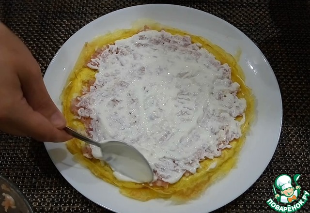 Фарш разделить на три части. Приготовьте соус, для этого в сметану выдавите чеснок и хорошенько перемешайте. Сметану можно заменить майонезом. На каждый блин распределить фарш по всей поверхности и смазать его сметано-чесночным соусом.