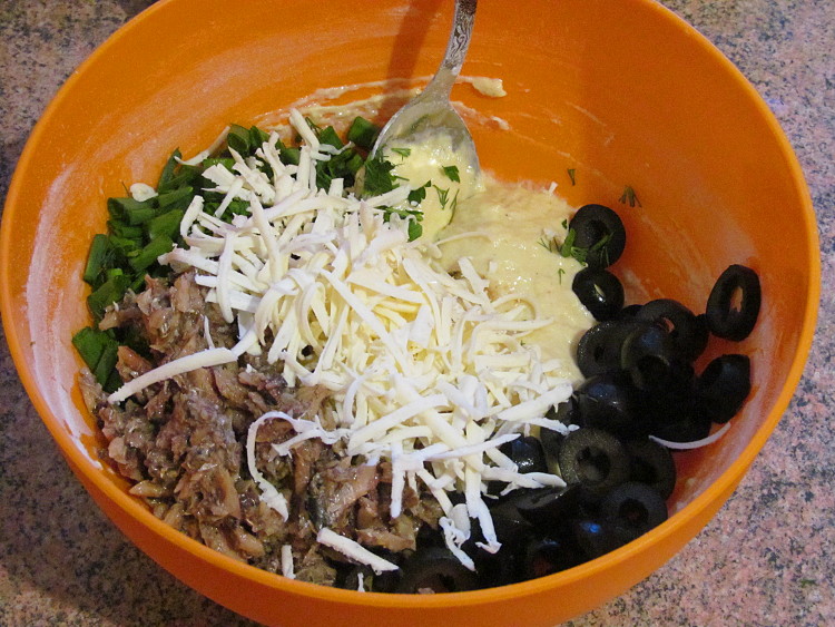 Затем добавить рыбу, натертый сыр, маслины и нарезанную зелень.