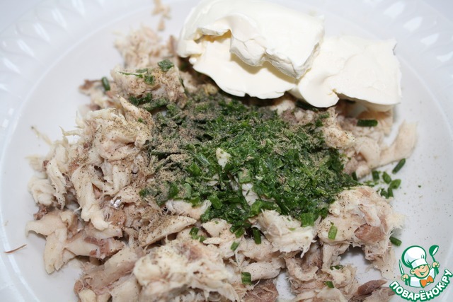 Скумбрию разобрать на волокна, добавить сливочный сыр, сок лимона, мелко нарезаный лук и петрушку.